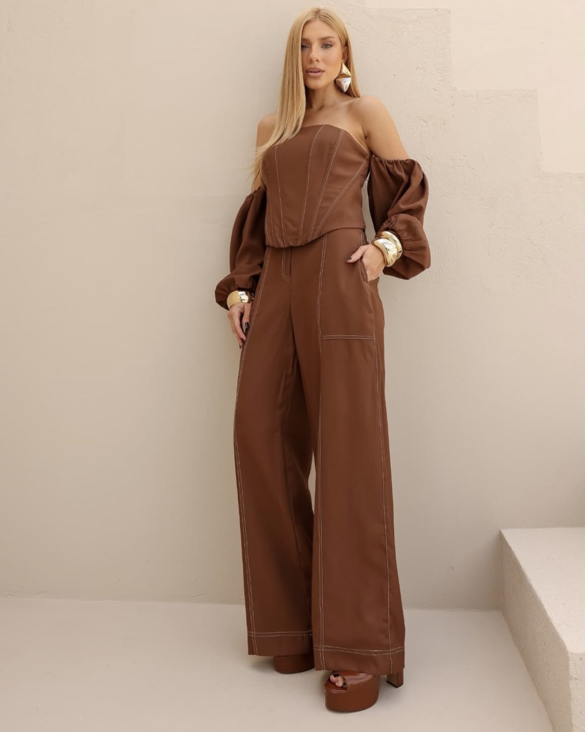 Conjuno blusa corset com mangas bufantes, e pantalona cos alto.