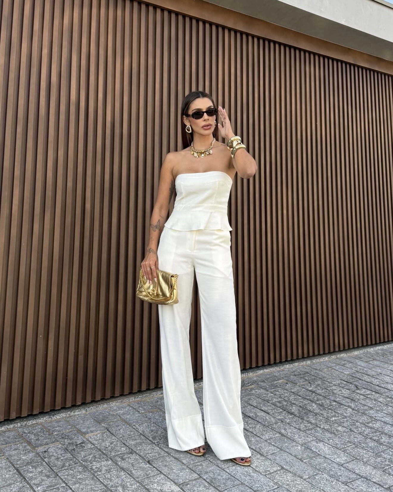 Conjunto de duas peças, blusa cropped peplum e pantalona.