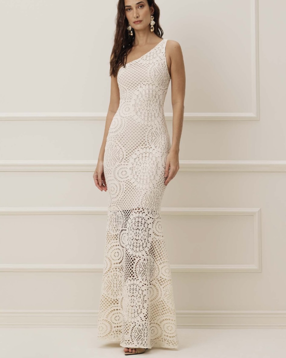 Vestido longo ombro único com textura e elastano que se ajusta ao corpo.